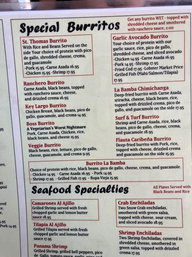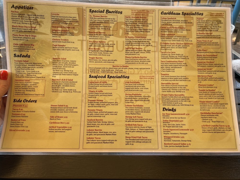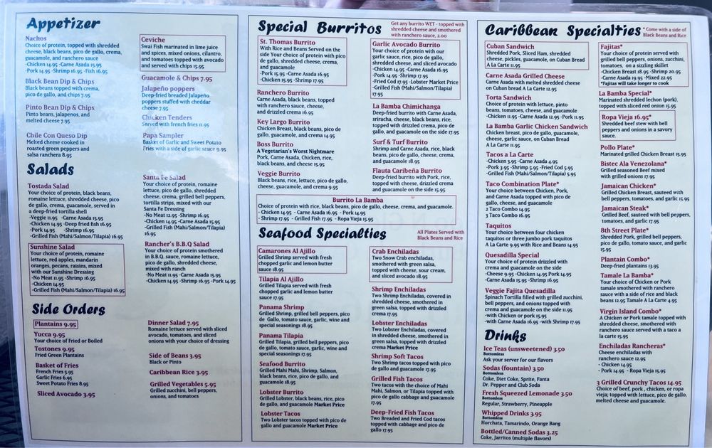 La Bamba Island Cuisine in Burbank, CA offers a variety of amenities such as delivery, takeout, vegan options, and outdoor seating. They serve a range of beverages including iced tea, fruit shakes, and Cuban coffee. Their menu features delicious salads like the Sunshine Salad and special burritos like The St. Thomas Burrito. Customers rave about the vegetarian burrito, steak, and margaritas. The ambiance is classic and the staff is friendly, providing top-notch service. With a diverse menu and friendly environment, La Bamba Island Cuisine is a must-visit for those looking for delicious island-inspired dishes in a welcoming setting.