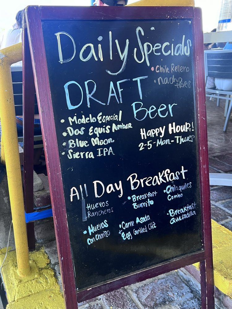 Two eggs medium over easy on top of a corn tostada with pinto beans. Smothered in ranchera sauce. Served with rice and pinto beans. Drizzled with crema